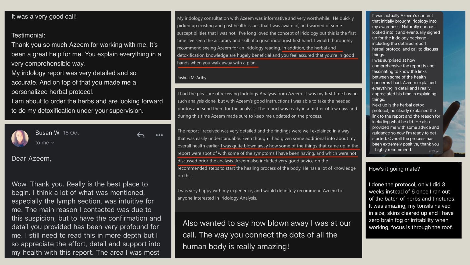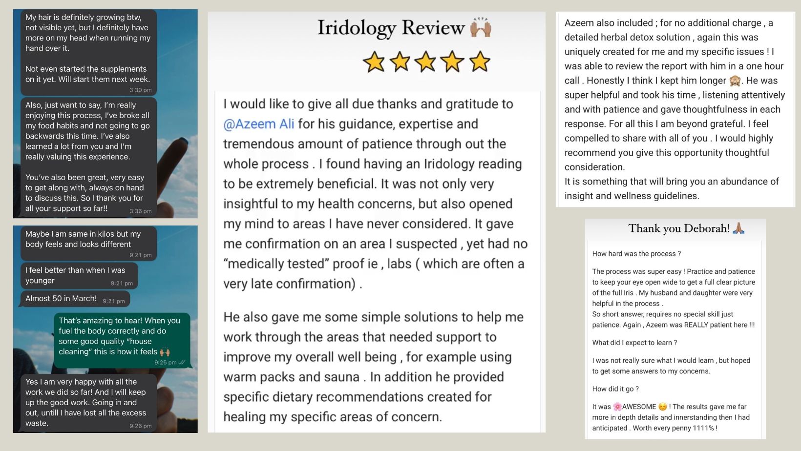 Azeem has spent more than a decade studying natural detoxification and regenerative health, including formal training under Dr. Robert Morse at the School of Healing Arts & Sciences. Over the years he has helped 550+ people work through naturopathic cleansing protocols and has personally analysed 200+ irises, developing a deep understanding of how the body reveals its internal terrain through the eyes.